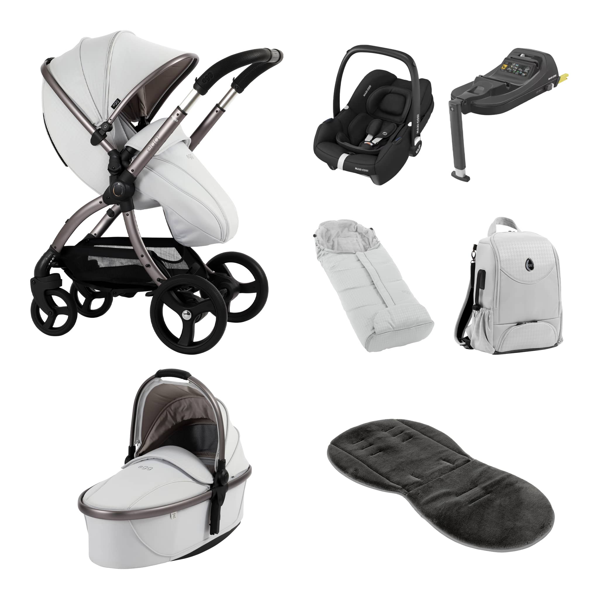 The beautiful soft lined egg3® carrycot comes with a mattress and raincover, as well as a fully adjustable hood and zip on carrycot apron.